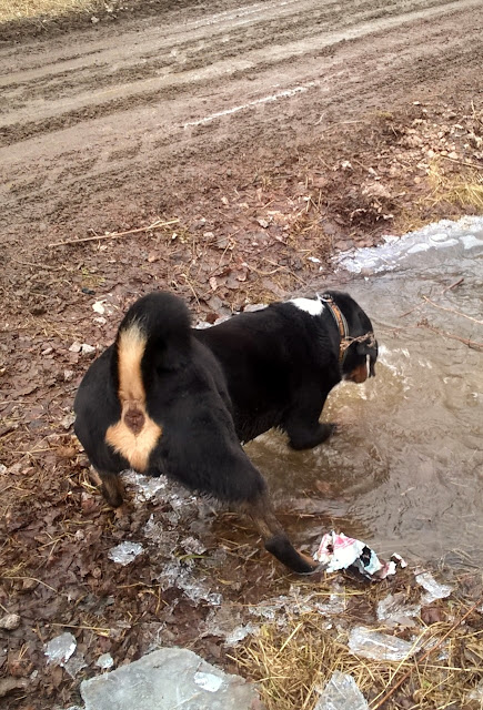 Tällä viikolla on ollut poneilla melkein lomaviikko, kun maanantaina kävin vaan harjaamassa ja perjantaina ja lauantaina en käynyt tallilla ollenkaan. Molemmat ovat tehneet yhden ohjasajolenkin ja yhden "remmilenkin". Onneksi tarhassa alkaa olla osittain sulaa (ja kuraista), joten liikkuvat omatoimisestikin enemmän. Koirat taas ovat tällä viikolla liikkuneet sekin edestä, kun minulla on ollut aikaa ja kelitkin on olleet jotakuinkin kohdallaan. Käytiin jopa vuoden ensimmäinen pyörälenkki ja kyllä olikin kivaa, kaikilla. Koirat ei meinanneet nahoissaan pysyä ja alkumatkasta varsinkin sai kokoajan komentaa, ettei vauhti ihan hurjaksi riistäytynyt.